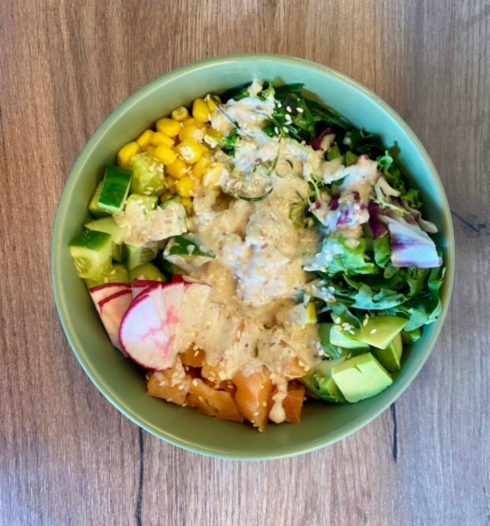 Нежный лосось слабой соли, рассыпчатый рис, хрустящий свежий огурец, сладкая кукуруза, авокадо, салатная смесь, чукка, ореховый соус.