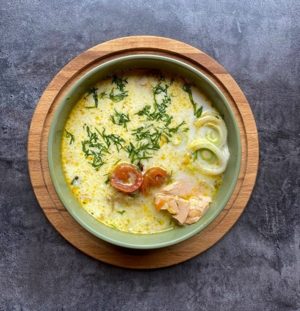 Два вида рыбного филе (тресковые породы и лосось), картофель, лук, морковь, специи, помидоры черри, сливки.