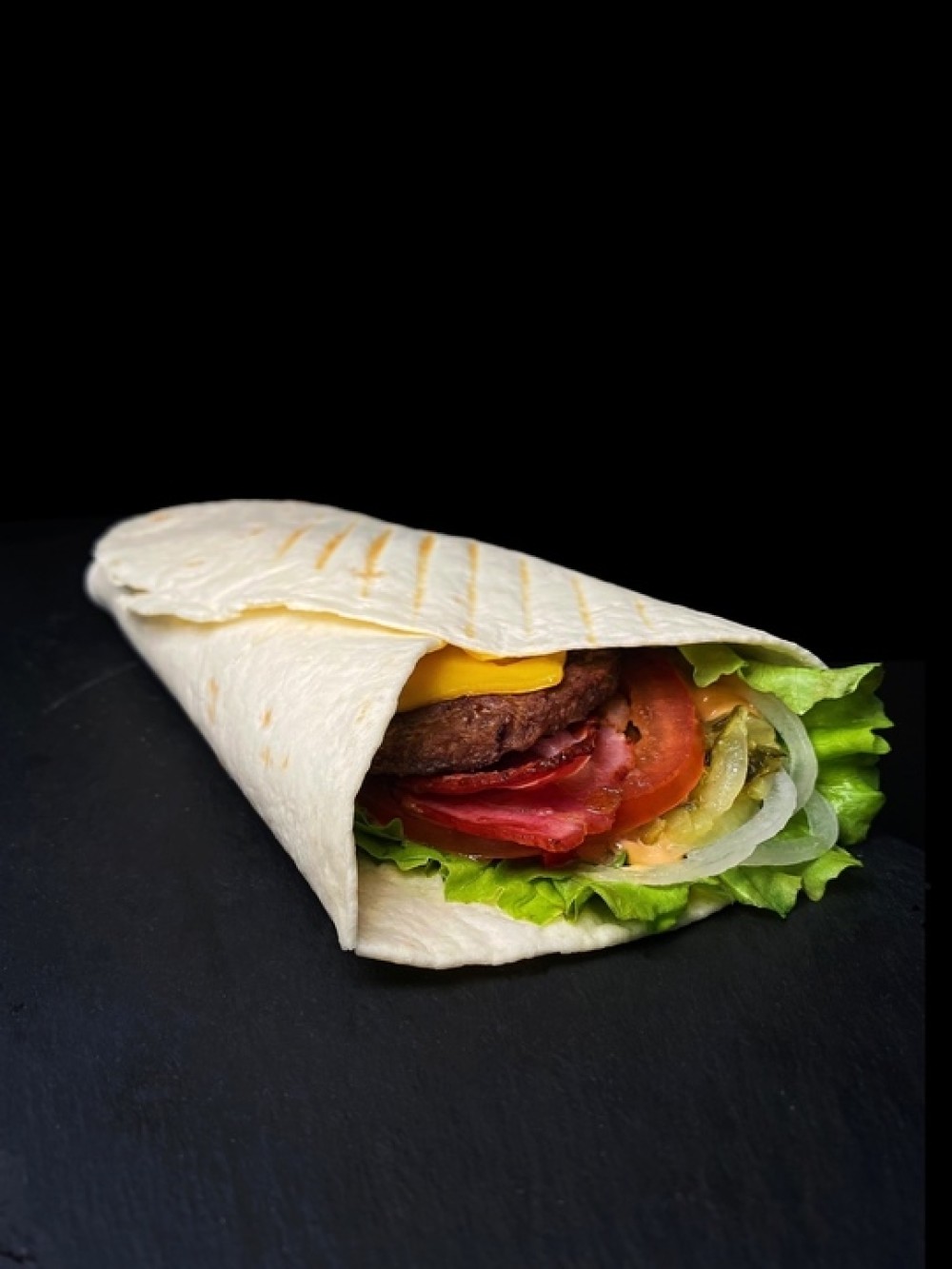 Пшеничная лепёшка, говяжья котлета, салат, маринованный лук, помидоры, огуречный салат релиш, жареный бекон, сыр, соус гриль