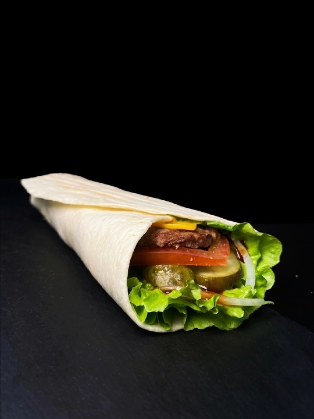Пшеничная лепёшка, говяжья котлета, салат,сыр, помидоры, маринованные лук и огурец, соус барбекю