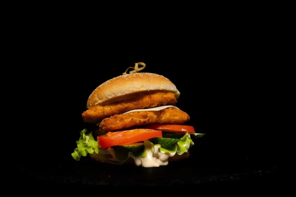 2 куриные котлеты, сыр чеддер, помидоры, свежий огурец, листовой салат, соус макси.