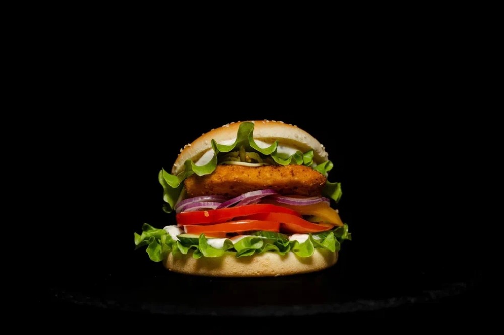 Куриная котлета, свежие овощи, салат, релиш, соус цезарь, сыр.