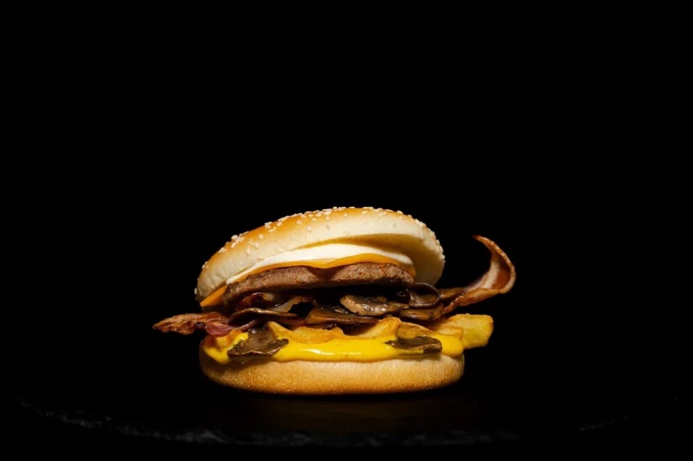 Говяжья котлета, грибы, чипсы, майонез, сыр чеддер, бекон, горчица.