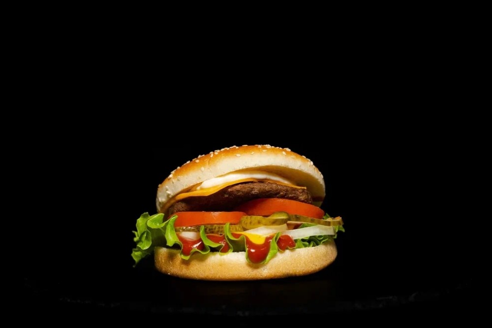 Говяжья котлета, сыр, маринованный лук и огурцы, салат, помидоры, кетчуп, горчица, майонез.