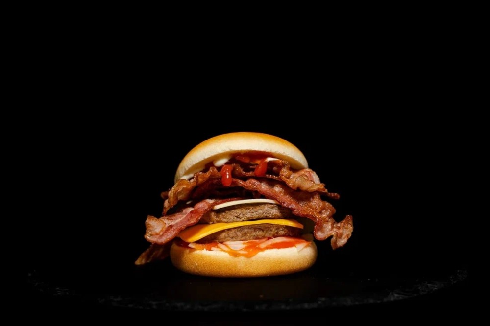 2 говяжьи котлеты, 2 вида сыра, много бекона, маринованный лук, острый соус и кетчунез.
