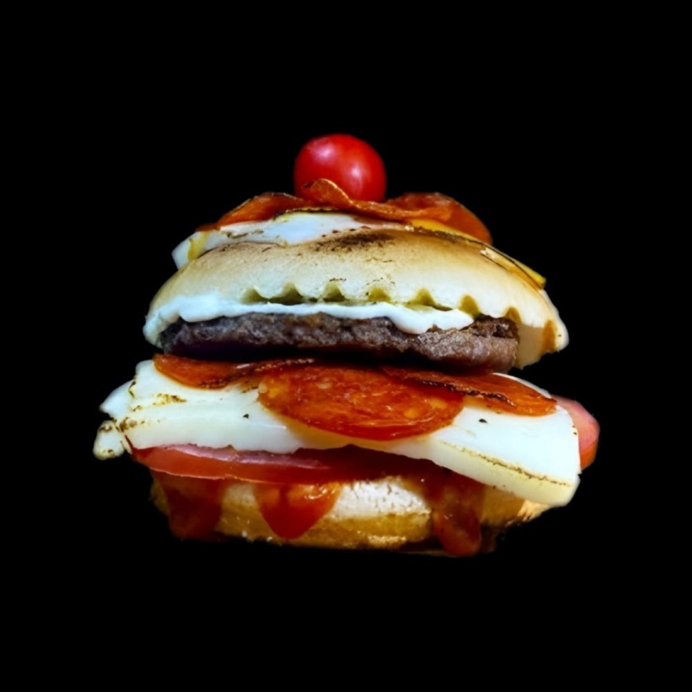 Говяжья котлета, много сыра моцарелла, помидоры, сыр чеддер, пепперони, сальса и майонез, шпажка с черри и маслиной.