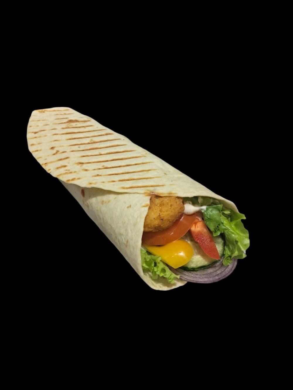 Стрипсы, листовой салат, свежие огурцы и помидоры, болгарский перец, красный лук, огуречный салат релиш, сыр чеддер, соус цезарь.