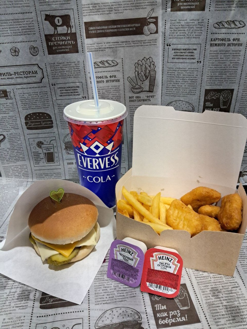 Дабл чизбургер, нагетсы 6, картофель фри, 2 соуса, напиток 0,5