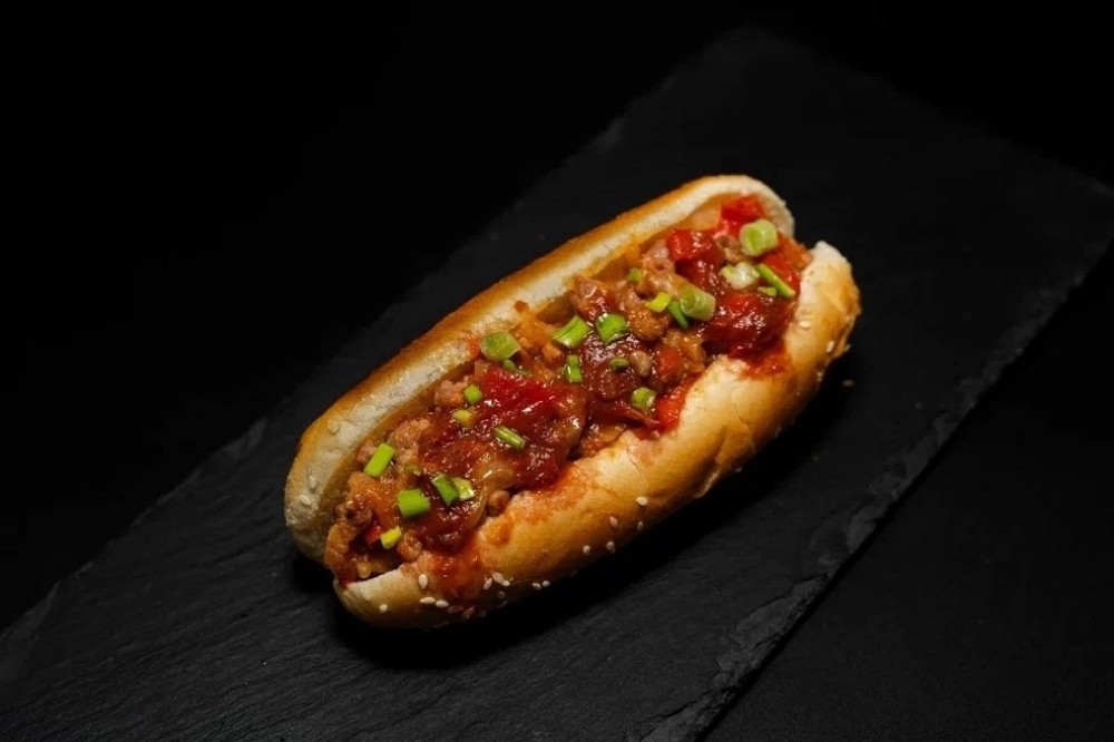 Поджарка из фарша, лука, помидор, болгарского перца и моркови по-корейски, перец халапеньо, соус сальса.