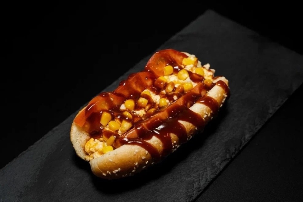 Скрэмбл, помидоры, кукуруза, колбаска, соус барбекю.