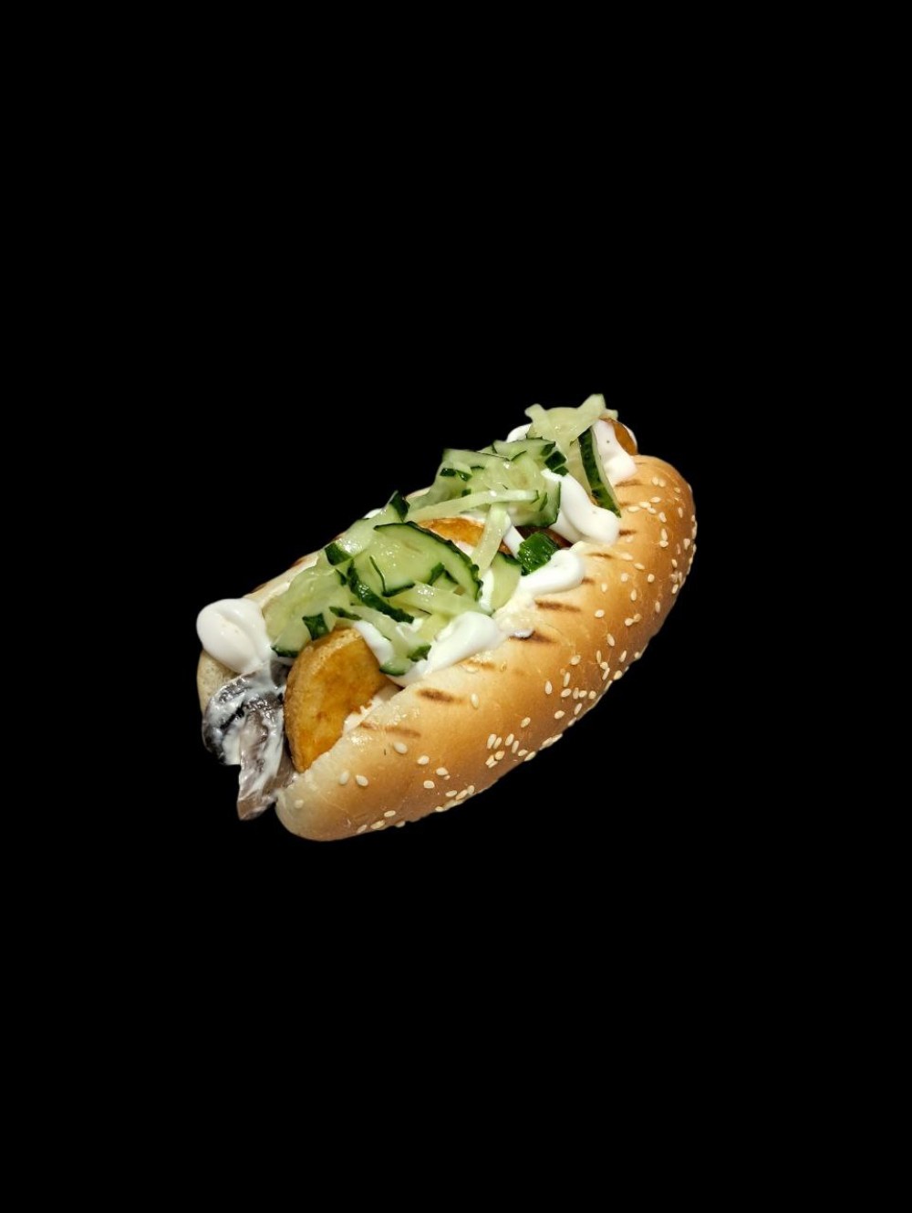 Жареная курица с грибами, айдахо, малосольные огурцы, грибной соус и майонез.